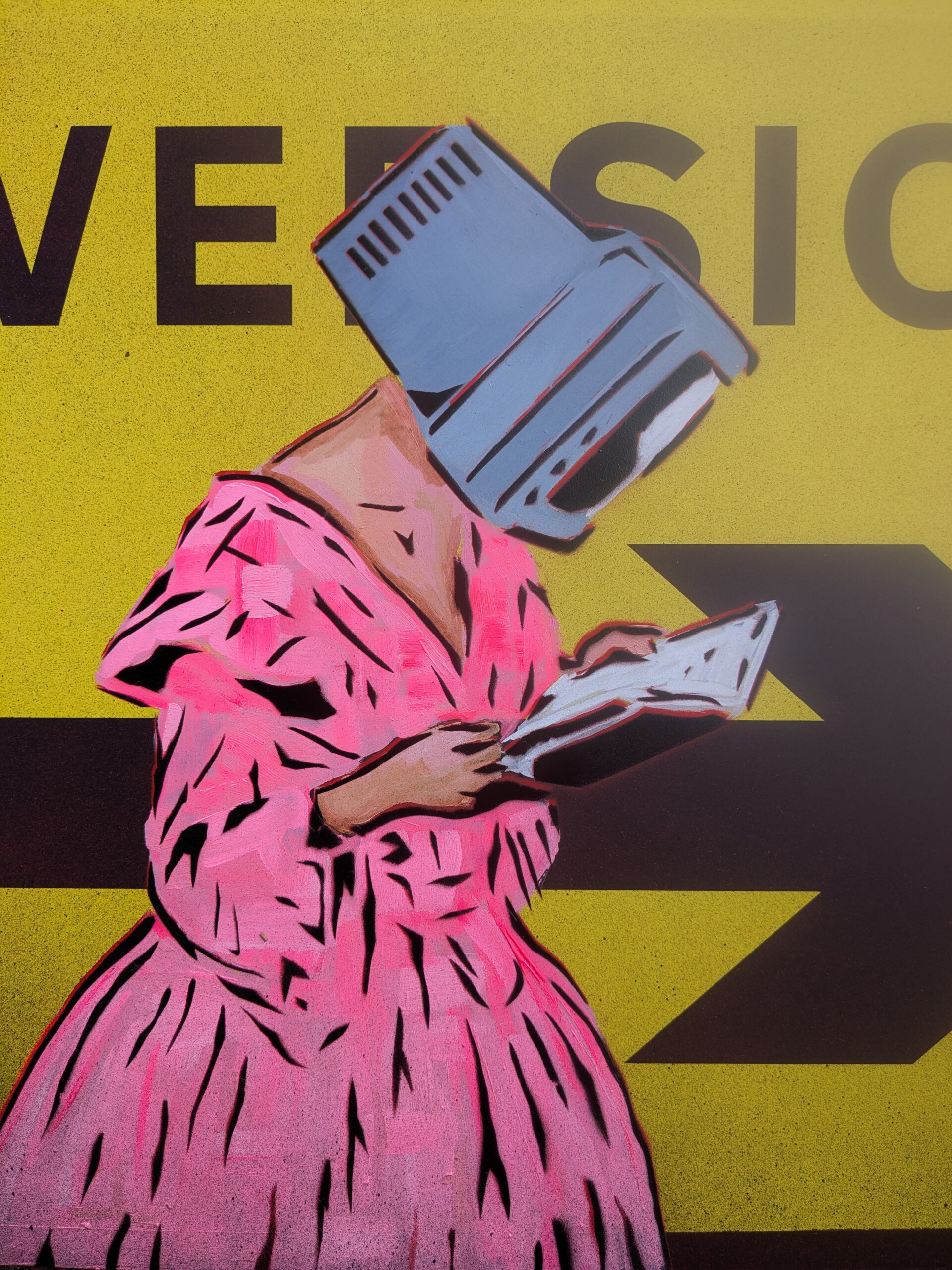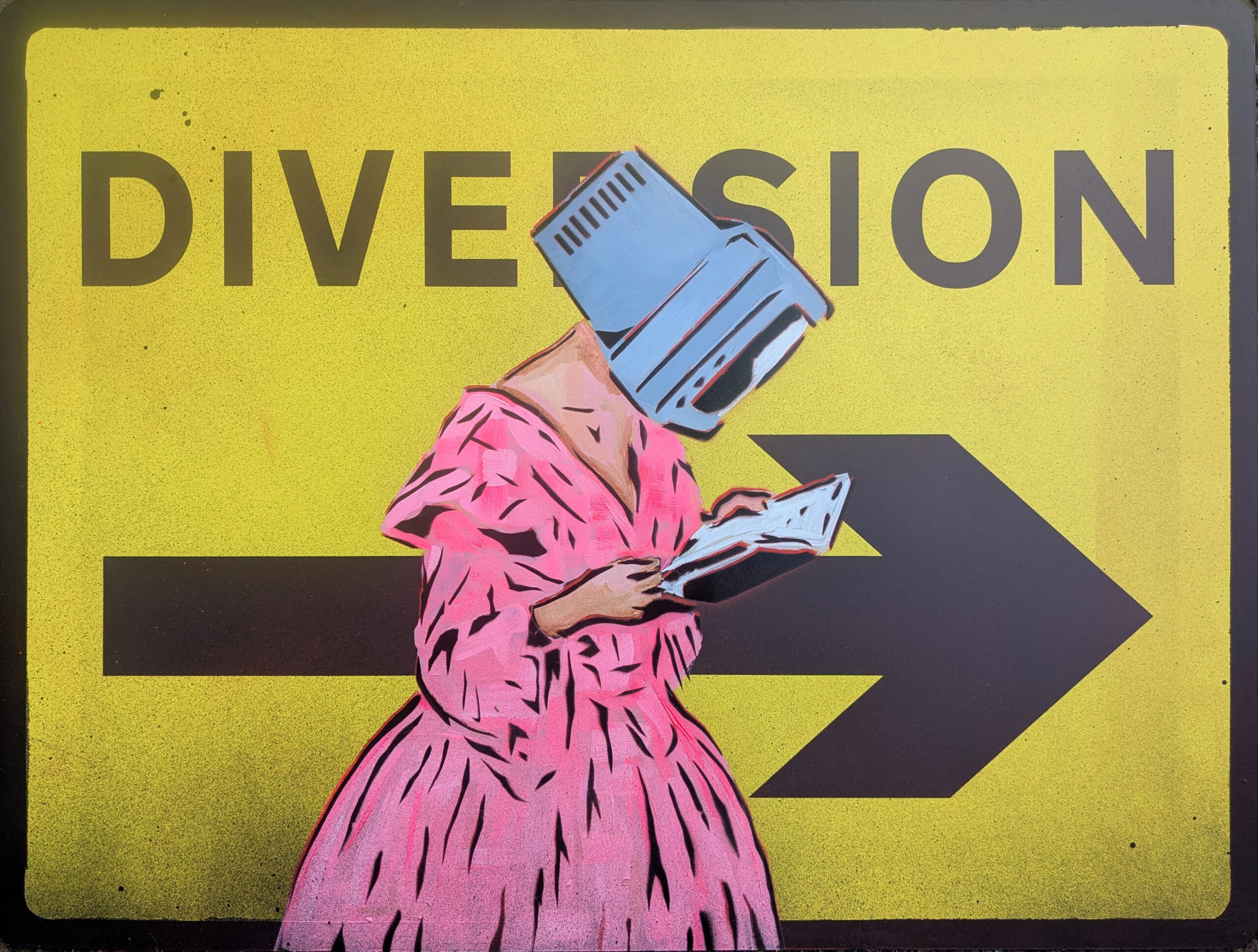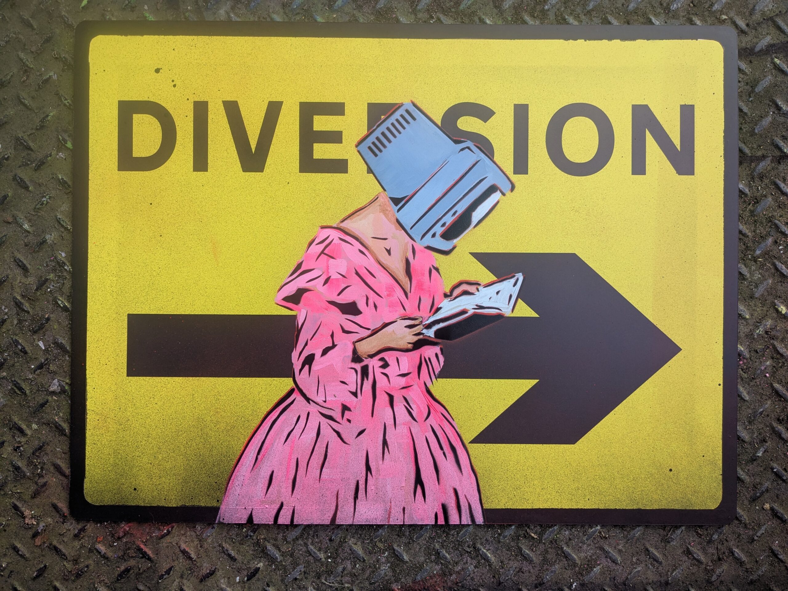 This piece is a multi layered stencil with a lot of under painting and general spray painting onto a 3mm plastic yellow diversion sign with slightly raised vinyl arrow and lettering.