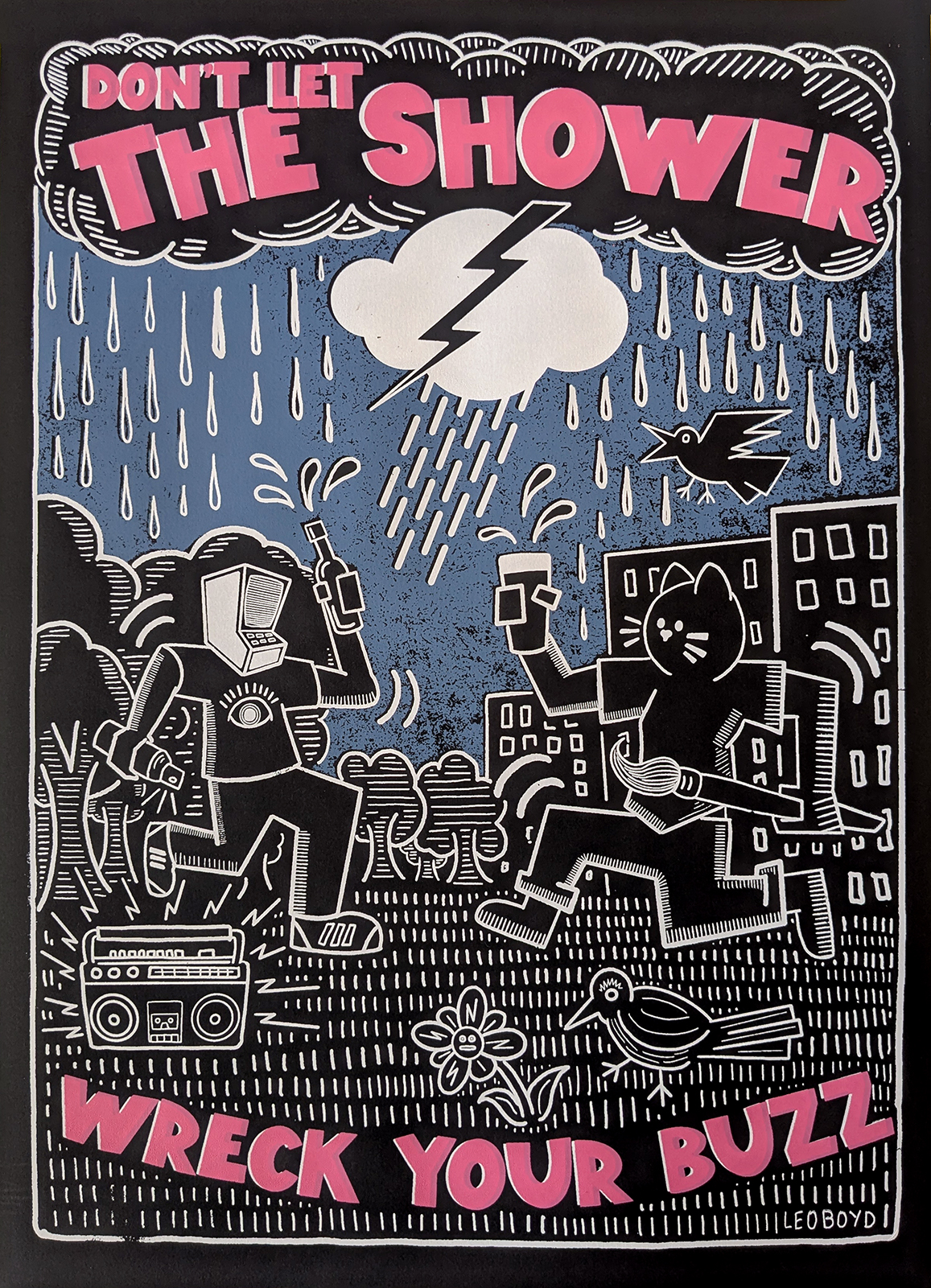 Don’t let the Shower Wreck You Buzz is a 3 colour A3 screen print onto black acid free paper and it measures 29cm x 42cm and each screen print is numbered and signed.