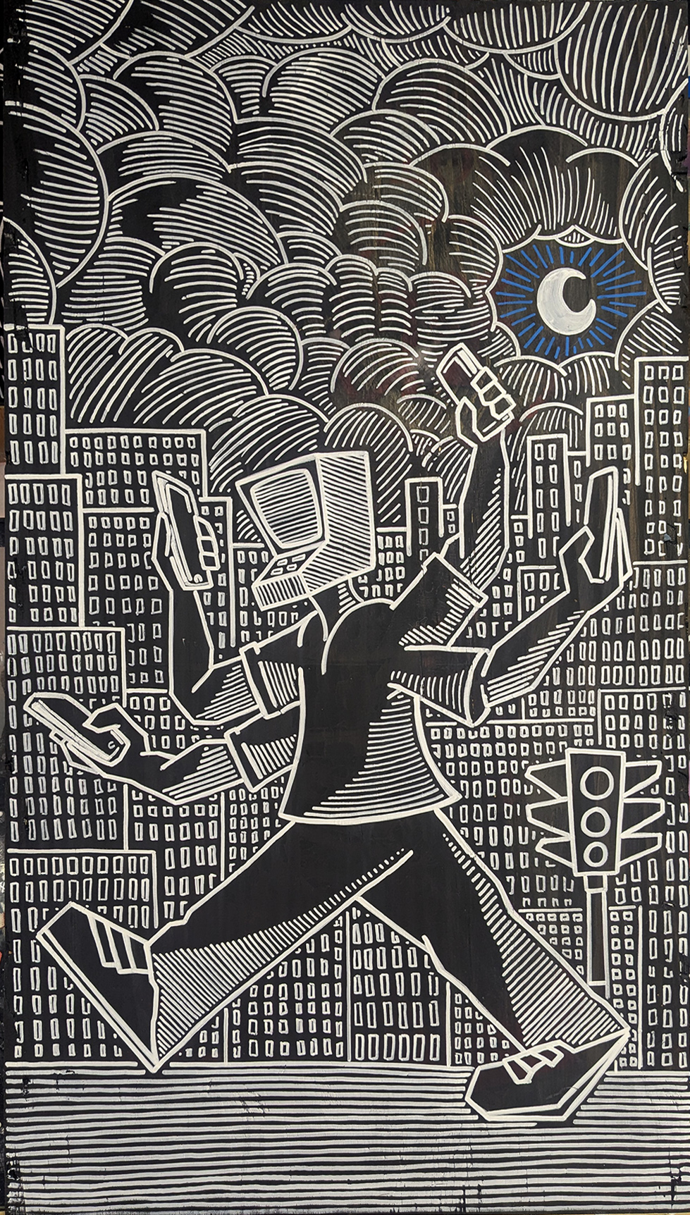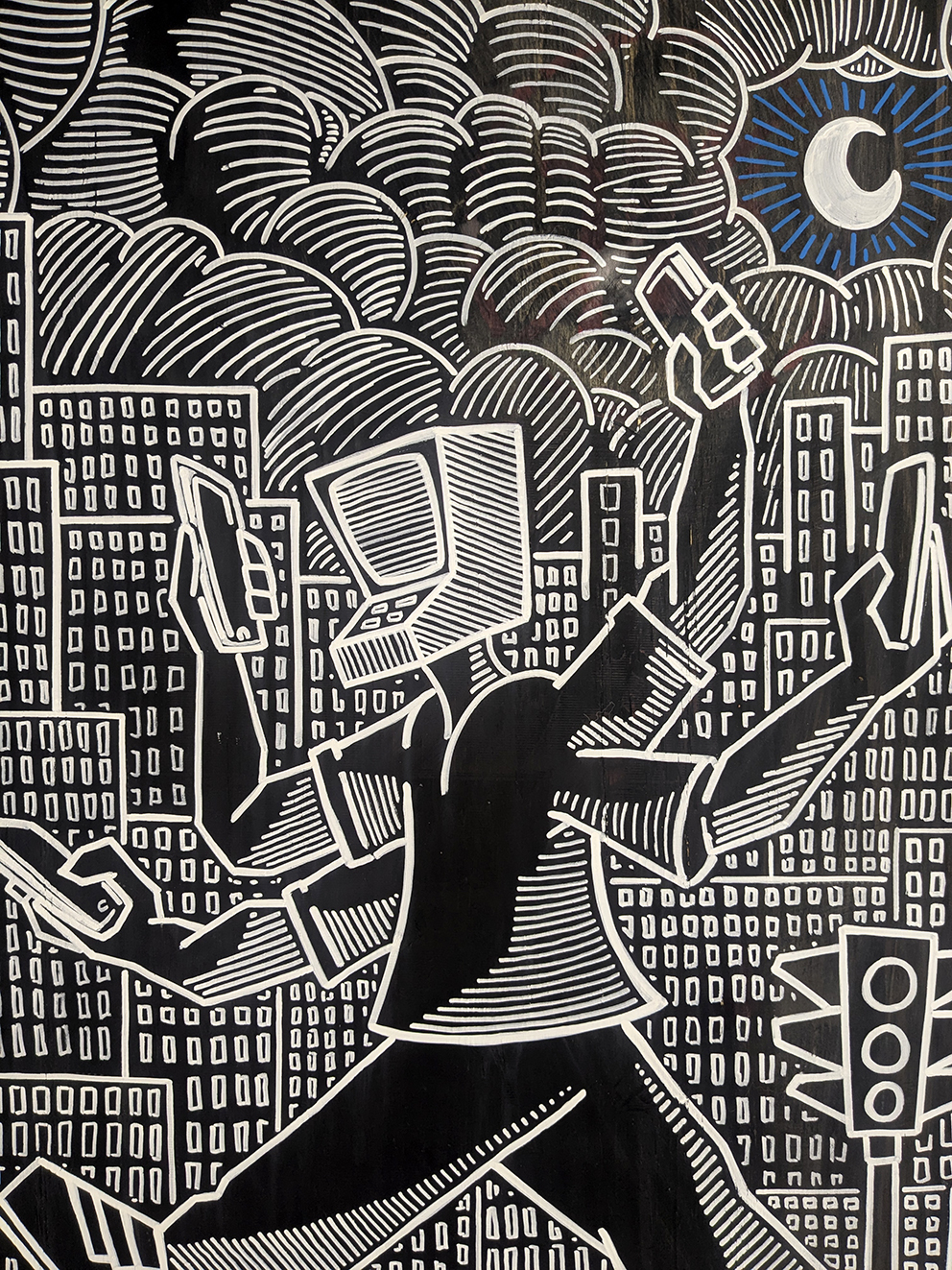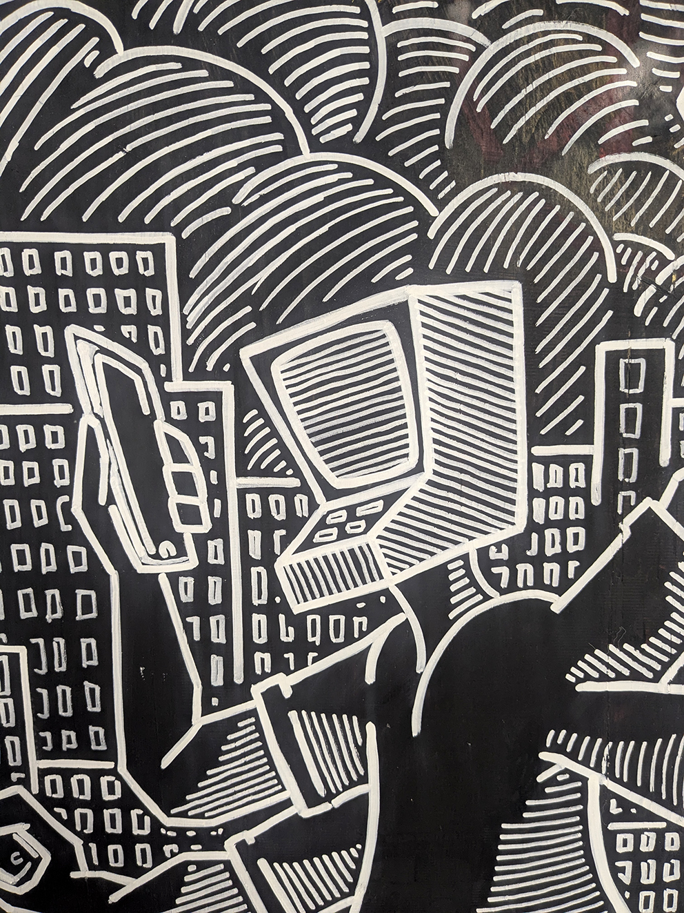Phones, Phones, Phones! Is drawn with Molotow white (and blue) acrylic paint pen onto black painted ply and it measures 57 x 124 cm.