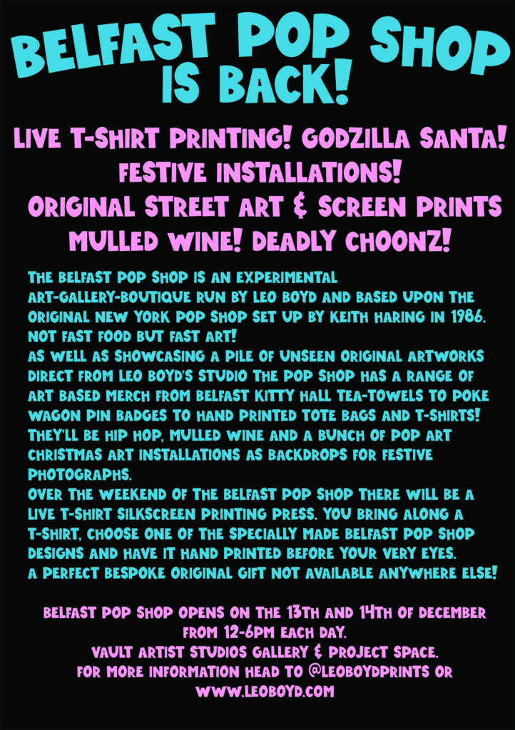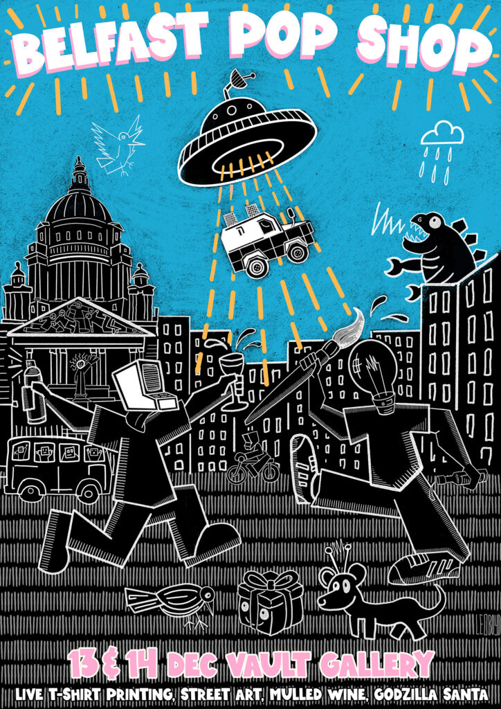 Belfast Pop Shop is back and this time it will be bigger and better than ever! Live t-shirt printing (bring your own t-shirt to have it printed with a specially made design), Godzilla Santa, mulled wine, new art and a general Christmas art sale! Belfast Pop Shop takes place on the 13th and 14th of December in Vault Artist Studios Gallery near the Albert clock!