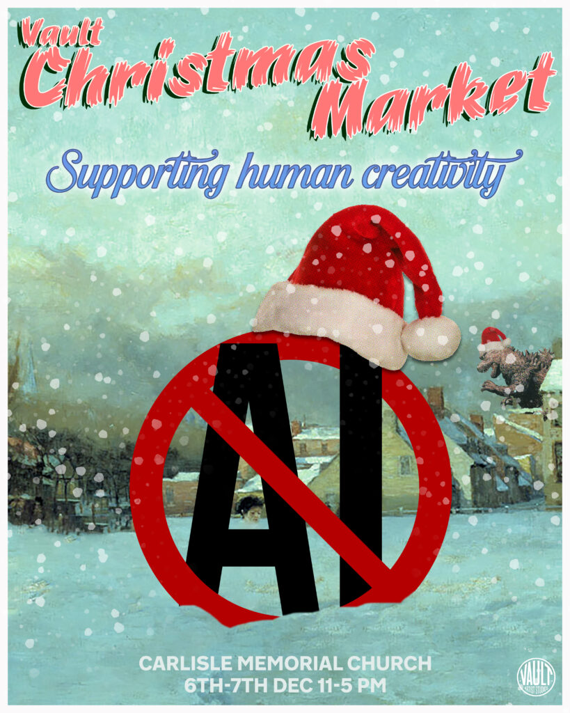 Since its inception, I have been heavily involved in the design and organising of Vault’s annual Christmas Market and this year I thought it would be good to come out against the increasing use of AI generated images in daily life. I wrote a short piece for Vault about AI and the market and here it is.