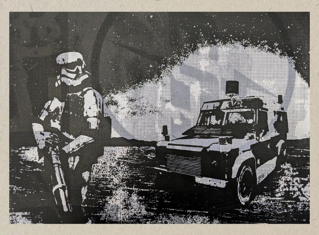 Armed with this new machine I set about going through old artworks of mine, selecting pieces from my chaotic back catalogue and adapting them so that they work as digital prints. Some of these are from my earliest screen print exhibition ‘The Belfast that Time Forgot’